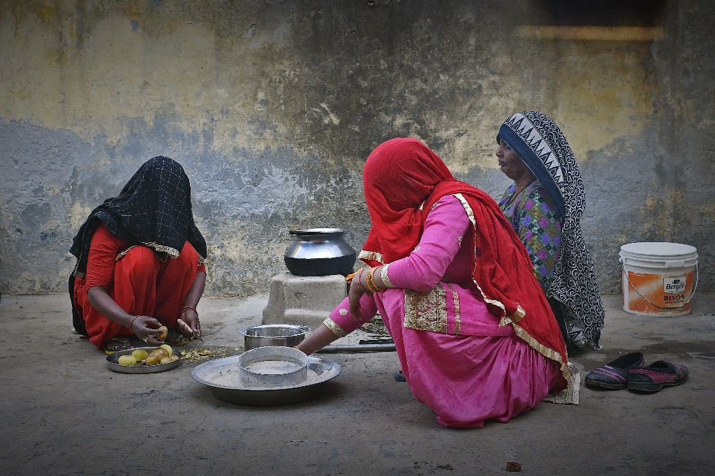 Women prepare food in a street in Dhamaka village, Haryana, India. (Photographer: Anindito Mukherjee/Bloomberg)