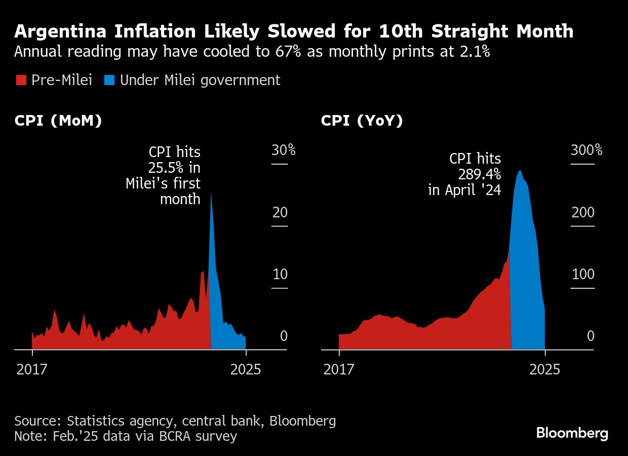 Argentina's national inflation all but certainly slowed for 10th month, possibly sinking below 70% — down from 289.4% last April. The monthly reading may cool from January's 2.2% print and local analysts see further disinflation ahead: they forecast 23.2% for year-end 2025 and 9.4% by 2027.