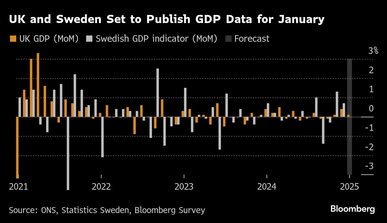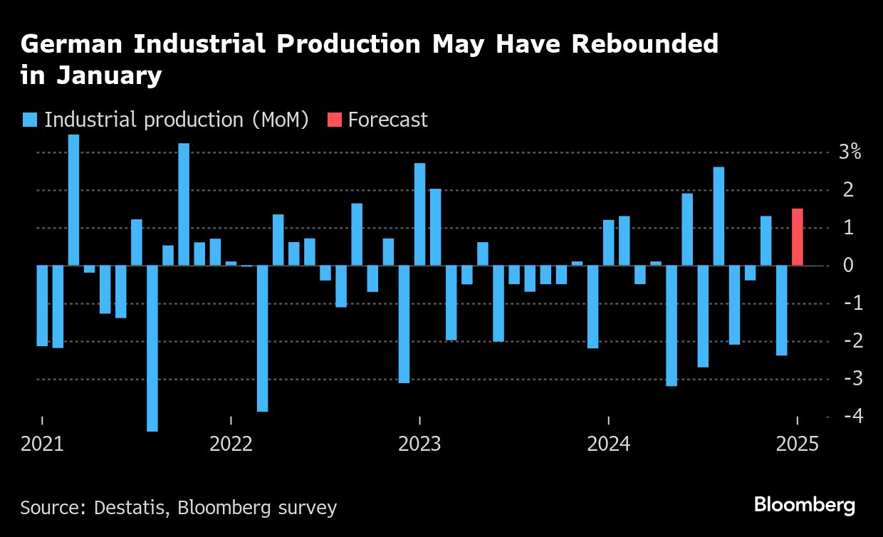 Prior to those figures, numbers from Germany will reveal how the country's sickly manufacturing businesses were faring before Friedrich Merz won the Feb. 23 election. He's working on a fiscal package that could prove a massive support to the country's crippled industrial backbone.