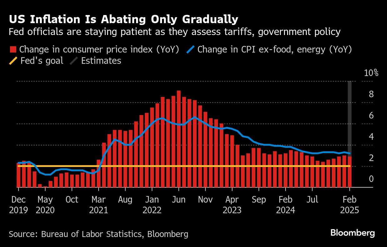 US consumer prices probably rose in February at a pace that illustrates plodding progress on inflation for Federal Reserve officials content to remain on the sidelines as they assess a policy whirlwind from the Trump administration.