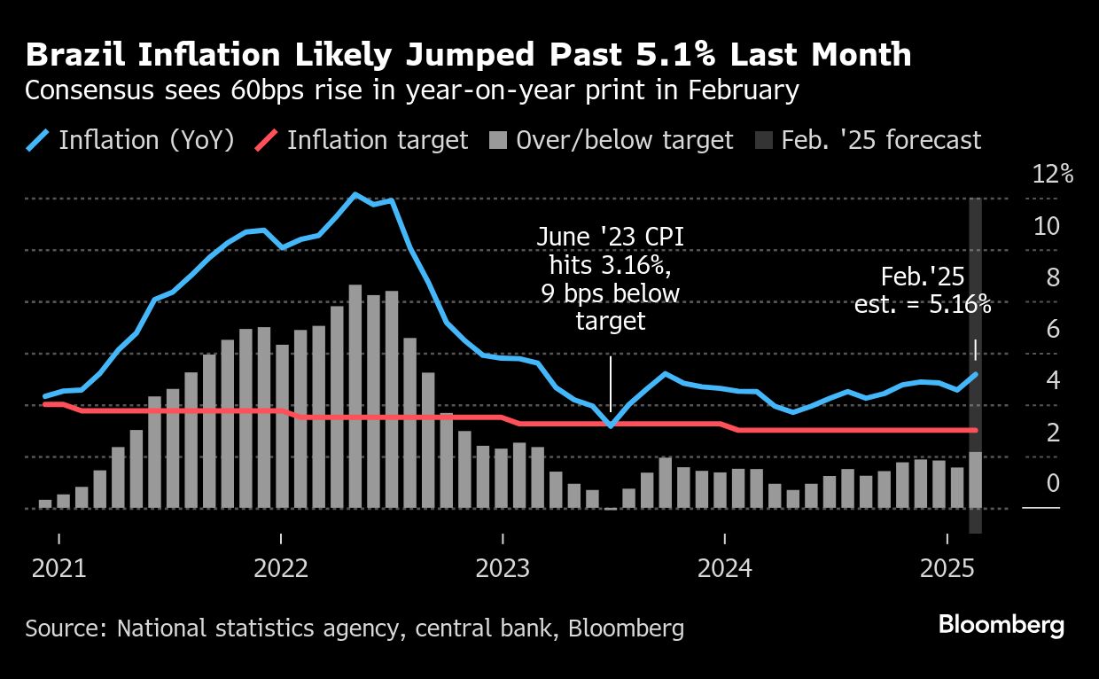 Brazil's February inflation report will likely show a roughly 60 basis-point jump in the year-on-year print to well over 5%, the highest since September 2023.