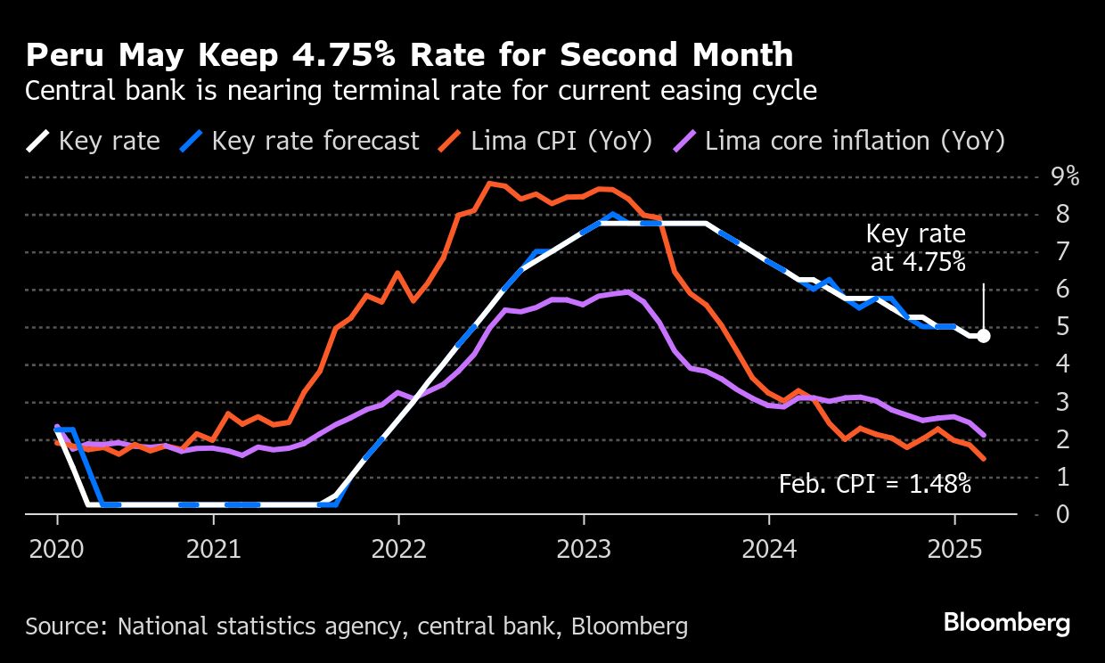 Inflation in February slowed to 1.48%, below the 2% mid-point off the central bank's 1%-to-3% target range, although policymakers led by President Julio Velarde may still opt to hold at 4.75%.