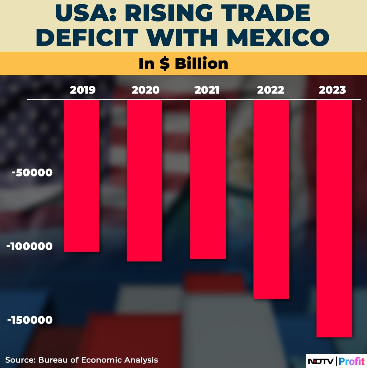 While imports from Mexico are rising, exports have not seen change as much. As such, the trade deficit with Mexico rose to $162 billion, according to data from the Bureau of Economic Analysis. In 2023, exports to Mexico accounted for 12% of total US exports, and imports from Mexico accounted for 13.7% of total US imports.