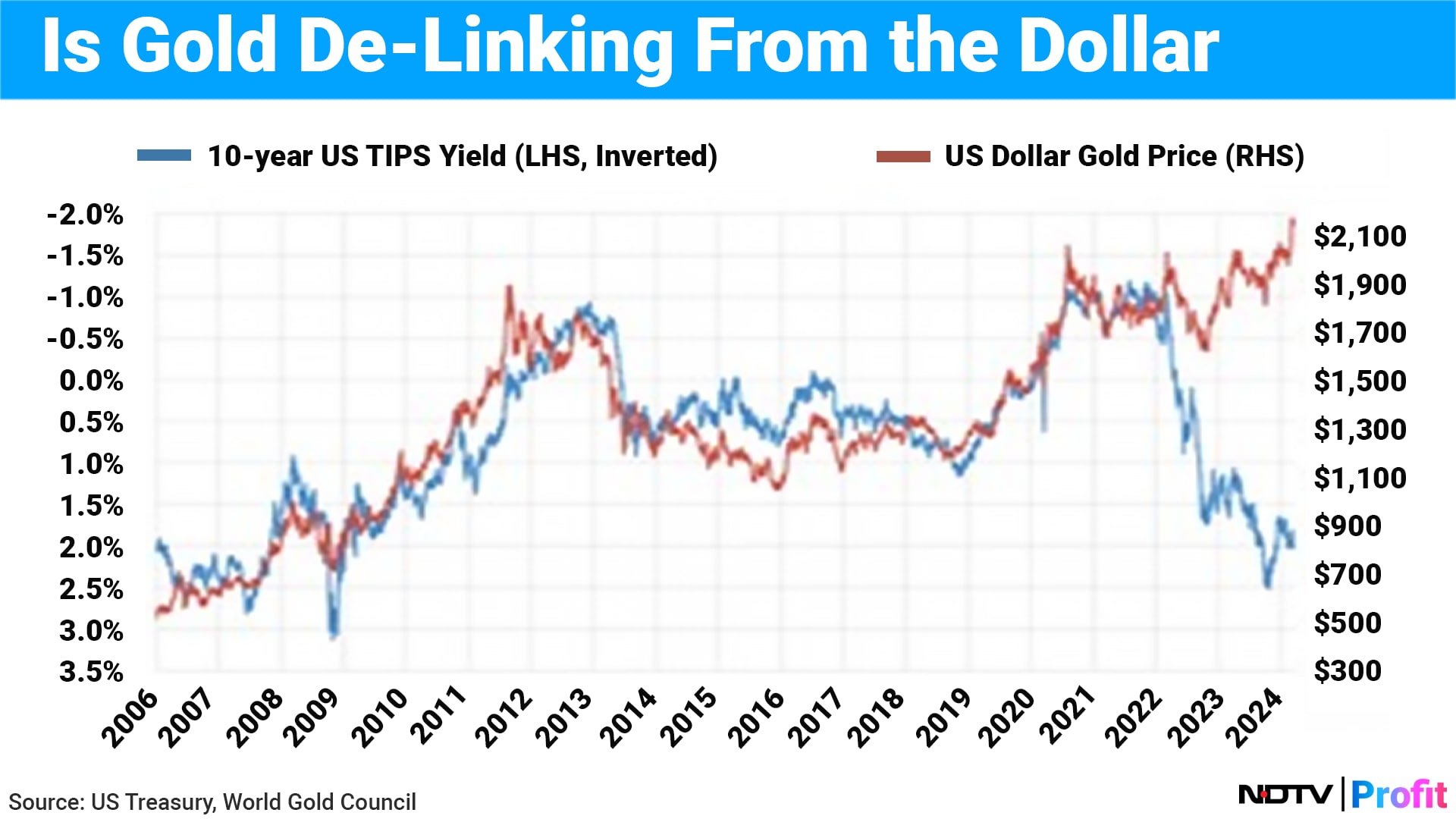 Ritesh Jain: I am bullish on both precious metals and base metals. Gold is entering the world monetary system as neutral reserve currency and what that means is gold is getting delinked from dollar. Below is the chart of US real yield and gold. It makes sense that when US dollar real yield rises, then gold should fall, because gold neither pays interest nor pays dividend.