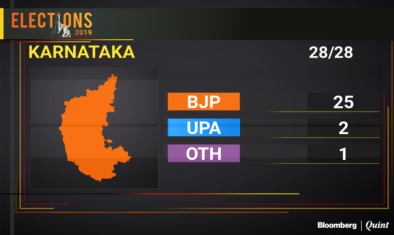 The BJP has bettered its 2014 tally of 17 and increased its vote share by almost eight percentage points to 51.4 percent. The Congress-JD(S) combine has a 42 percent vote share this time, down from 52.22 percent in 2014. The two contested separately the last time, when the Congress won nine seats with a vote share of 41.15 percent and the JD(S) got two with a vote share of 11.07 percent.