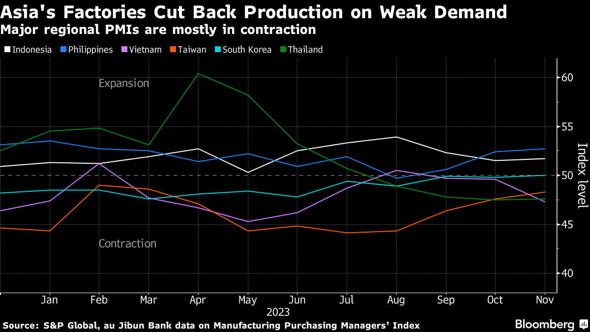 (Bloomberg) -- Manufacturing in Asia ended the year on a weak note as sluggish economic activity in China and other developed markets dampened demand for the region's goods.