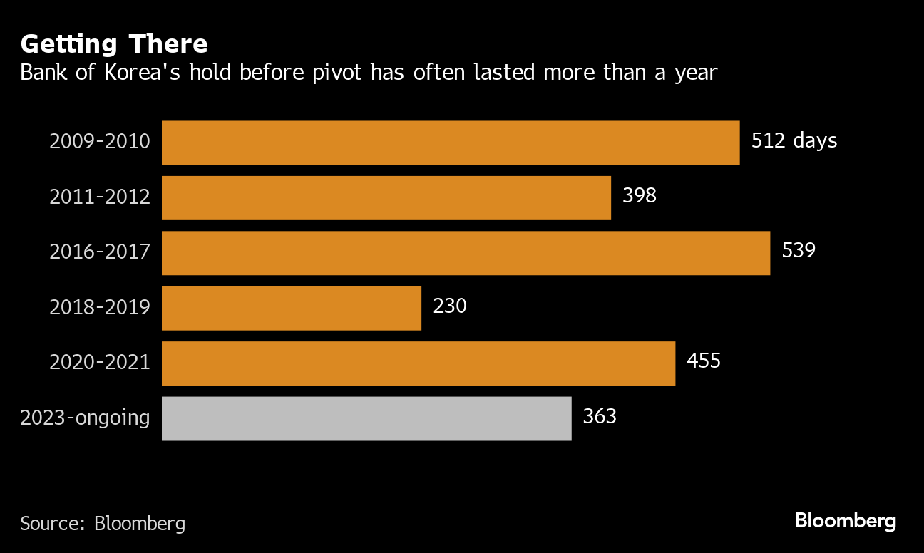 (Bloomberg) -- The Bank of Korea held its benchmark interest rate steady on Thursday, extending its inflation fight into the new year as market participants increasingly speculate it will pivot at some point this year to ease the strains on credit markets and economic growth.