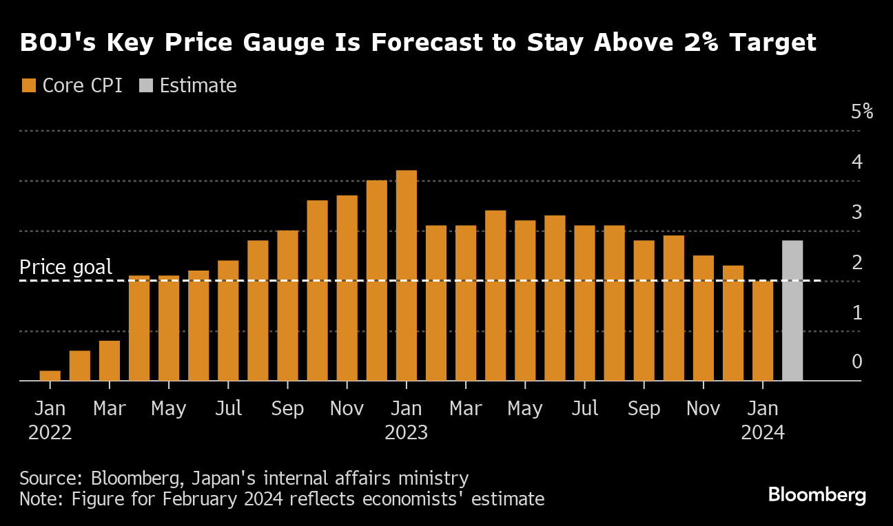 Some 38% of 50 economists surveyed by Bloomberg had expected the March rate liftoff, while another 54% predicted the move would come a month later. The survey was conducted before the strong results from annual wage negotiations that fueled widespread speculation the central bank wouldn't wait.