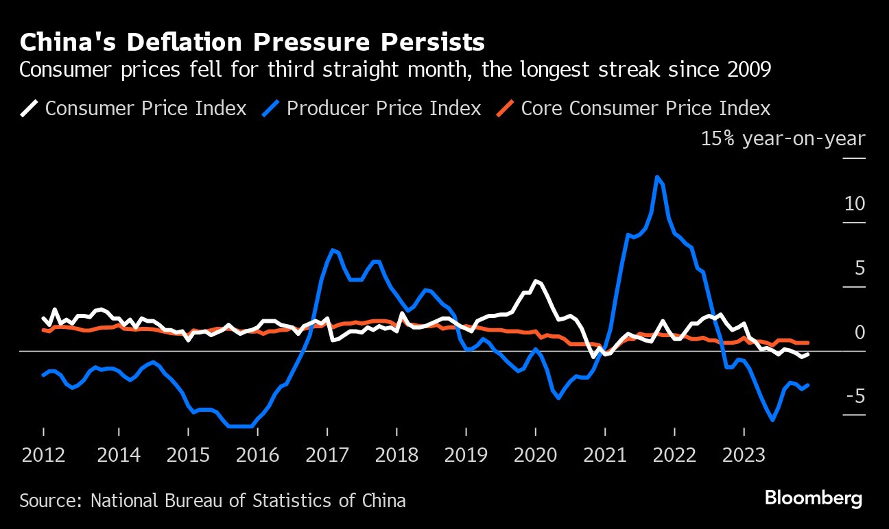 (Bloomberg) -- China's consumer prices marked their longest streak of declines since 2009, threatening a deflationary spiral that may require more government support to reverse. Its export growth engine is also faltering.