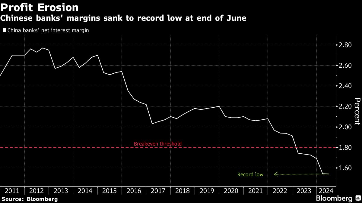 Chinese regulators are walking a fine line as they attempt to shore up the battered property market and economy while safeguarding the nation's $66 trillion financial system. Lowering rates too aggressively would pile pressure on the banks, which have already seen their margin tumble to a record low of 1.54% as of end-June, well below the 1.8% threshold regarded as necessary to maintain reasonable profitability.
