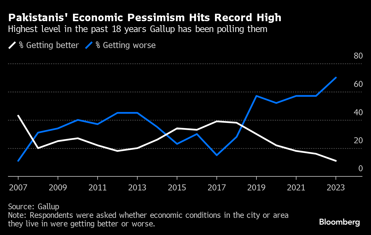 (Bloomberg) -- Pakistan's voters are the most pessimistic about their economy in years ahead of Thursday's election, according to a Gallup poll, as the fastest inflation in Asia makes it increasingly difficult for them to make ends meet.