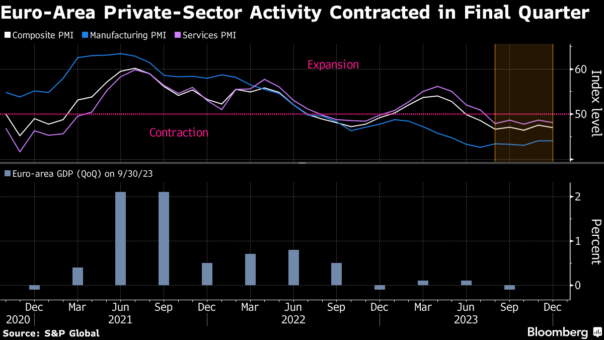 (Bloomberg) -- Private-sector activity in the euro area worsened at the end of the year, raising the risk that the region may experience a recession in the second half.
