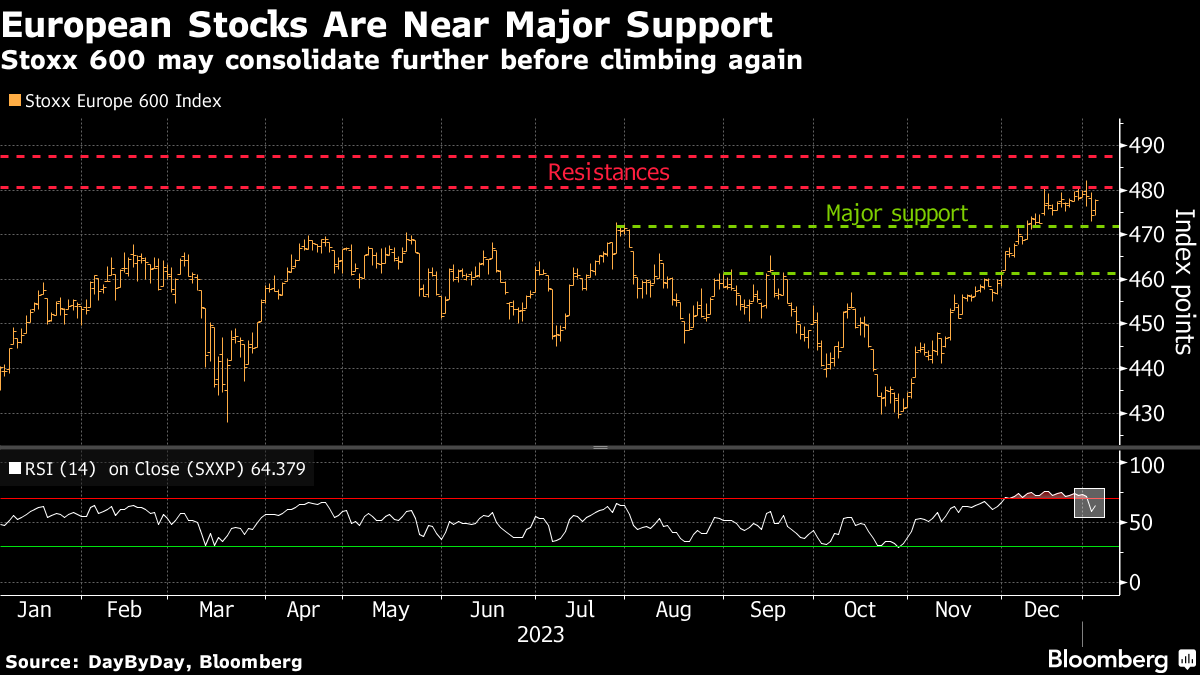 The Stoxx 600 appears set to snap a multiweek run of gains, with volatility on the rise, and some traders rotating into cheaper and more defensive shares. The benchmark index has slid toward some key support levels, which analysts say must hold if it's to stage a bounce.