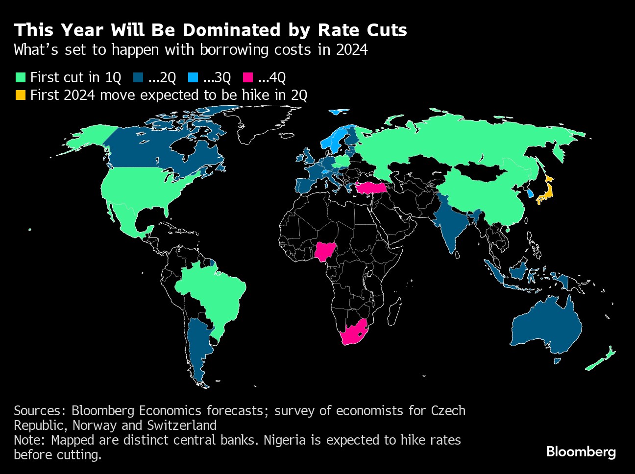 Here is Bloomberg's quarterly guide to the outlook for the world's top central banks, which set rate policy for a combined 90% of the global economy.