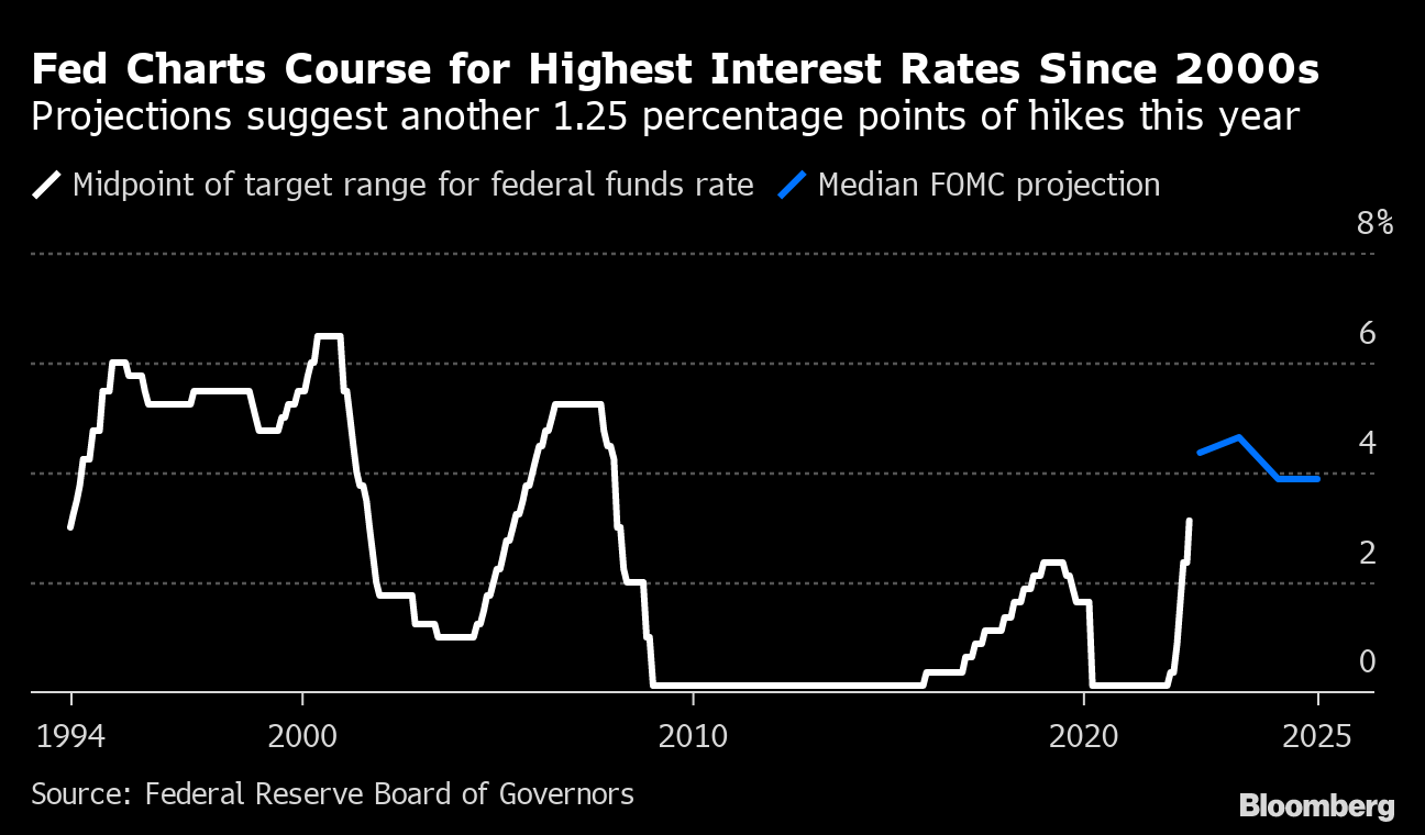 To achieve that, policy makers projected their benchmark rate would need to rise by a further 1.25 percentage points this year, according to their median forecast. That puts an increase of another 75 basis points on the table at their Nov. 1-2 gathering, followed by a down-shift to a half-point hike in mid-December. They have already raised rates from near zero in March to the current target range of 3%-3.25%.