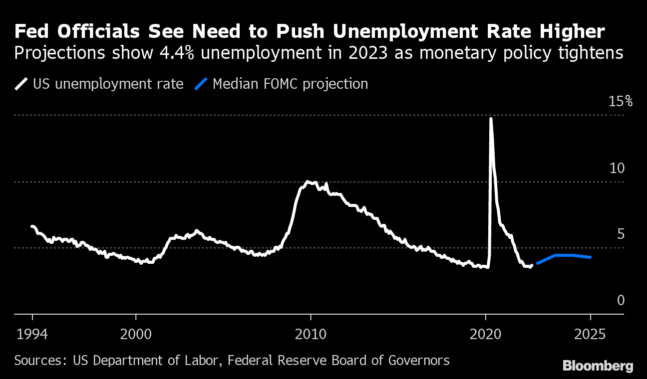 Quarterly forecasts published Wednesday by the Federal Open Market Committee showed officials now see the need to push the unemployment rate up to 4.4% by the end of next year -- from 3.7% last month -- to bring inflation down from four-decade highs. That implies about 1.2 million workers may lose their jobs as the cost of the Fed's inflation fight.