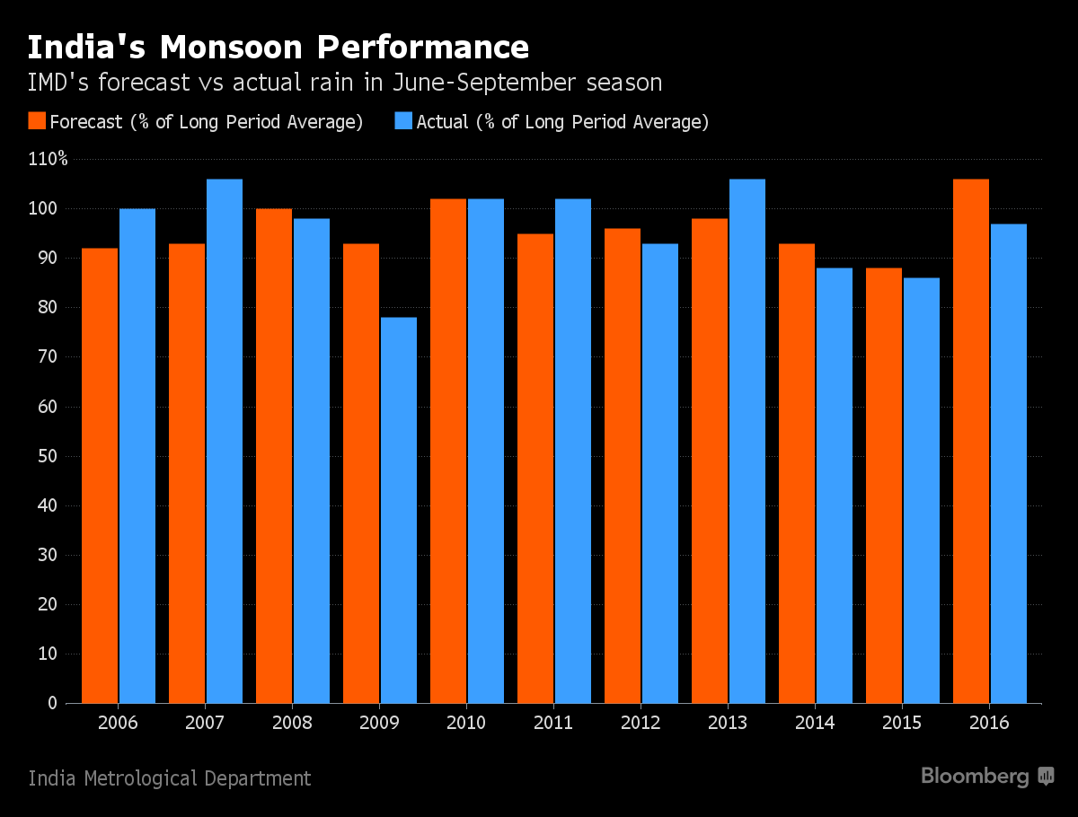 The meteorology department accurately predicted monsoon rainfall in four out of the last 10 years, according to Bloomberg calculations that take into account its forecast error margin.