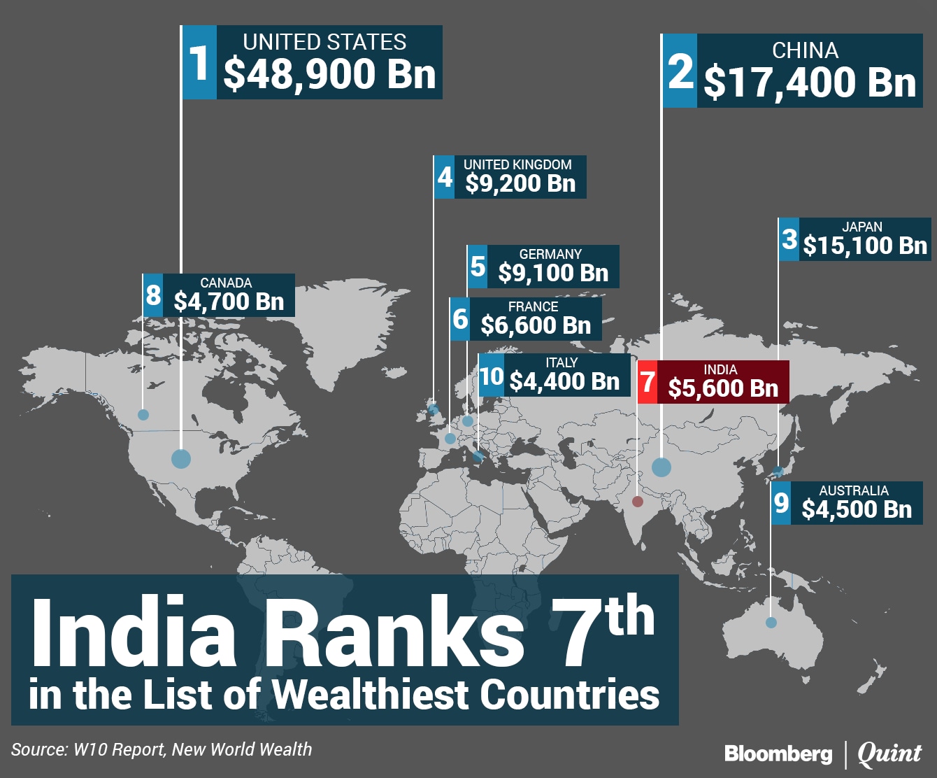 India has figured among the top 10 wealthiest countries in the world with a total individual wealth of $5,600 billion while the United States topped the chart.