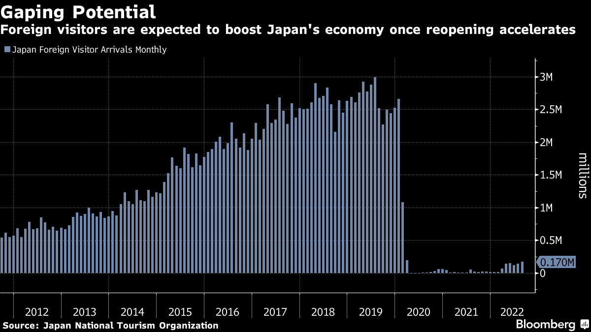 As one of the last remaining rich economies to reopen for tourism, there's anticipation of an economic lift that could eclipse the pre-pandemic travel boom. Inbound spending could rise by 32% to 6.6 trillion yen ($45.4 billion) annually after a full reopening compared with 2019, according to a recent report by Goldman Sachs economists.