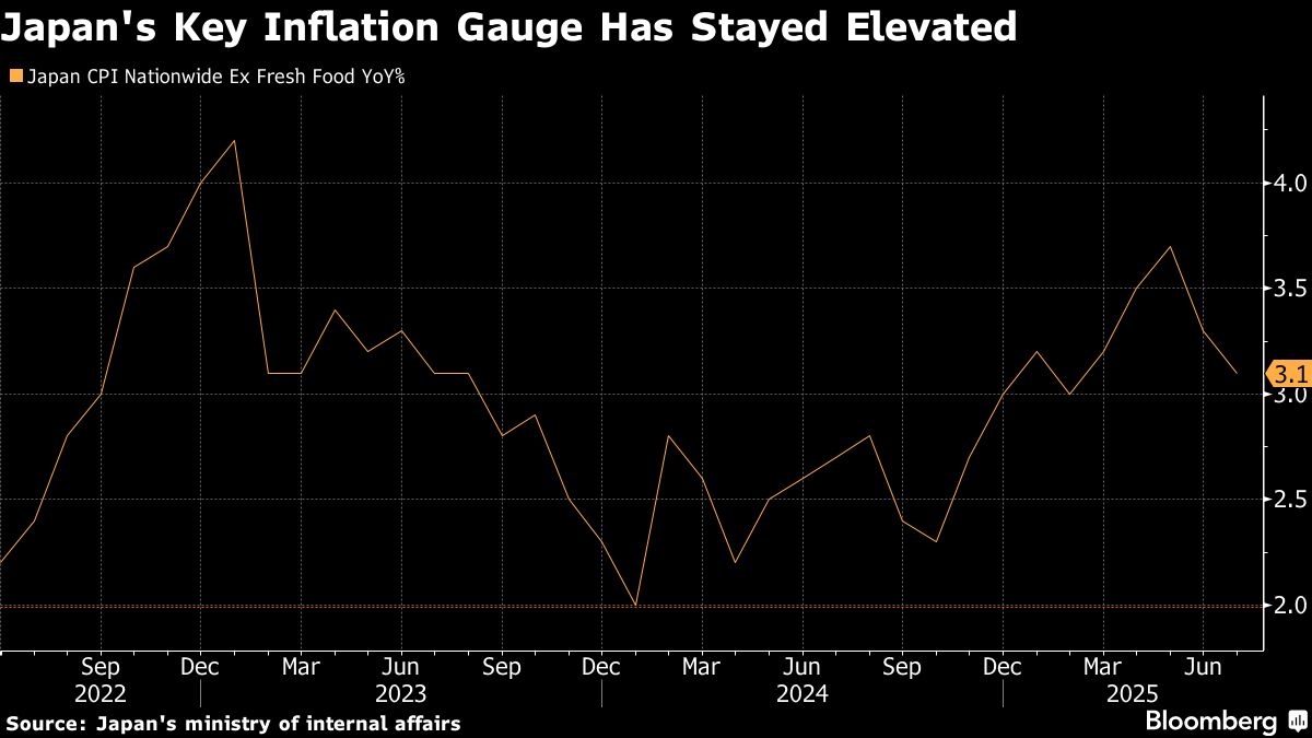 Consumer prices excluding fresh food rose 3.1% from a year earlier in July, slowing from a 3.3% gain in the previous month, the Ministry of Internal Affairs and Communications reported Friday. The median estimate of economists was for a gain of 3%, with expectations there would be a drag from energy prices after they spiked a year earlier