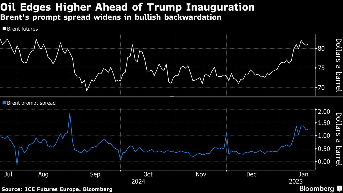 Brent traded above $81 a barrel after falling in the past two sessions, while West Texas Intermediate was near $78. Trump is planning a flurry of executive orders on day one including energy, has threatened hefty tariffs on China, Canada and Mexico, and could implement sanctions on Iran.