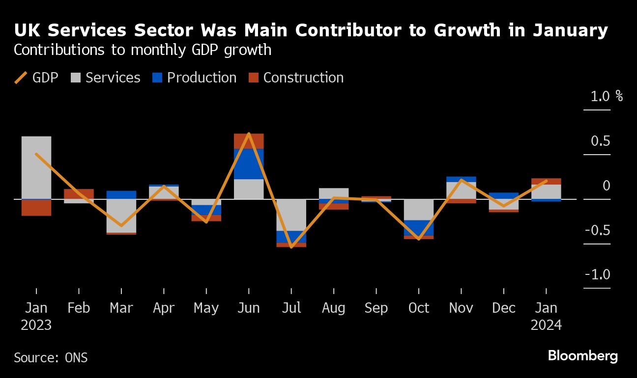 (Bloomberg) -- The UK economy rebounded in January, registering modest growth after falling into a technical recession in the second half of last year.