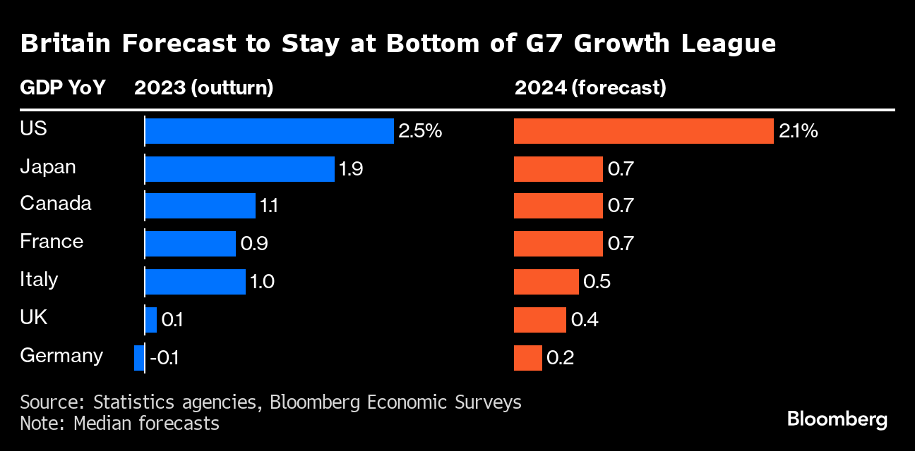 However, the recovery is likely to be modest as past interest-rate increases continue to feed through to households and companies. Analysts expect the UK to trail every other Group of Seven country except Germany for another year.