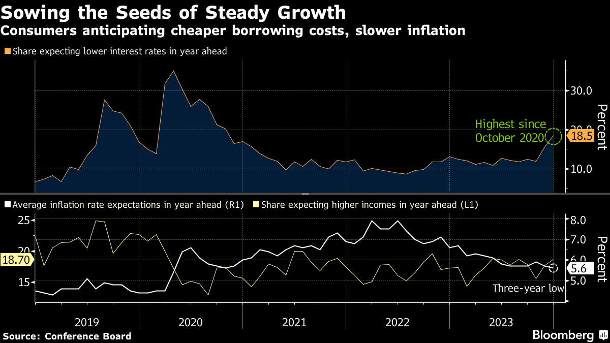 The report showed optimism across the board, from job prospects and inflation to future incomes and business conditions. More Americans said they are planning to go on vacation, buy a car or purchase big appliances. The results point to an economy holding up well going into 2024.