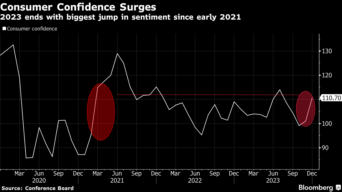 (Bloomberg) -- US consumer confidence rose in December by the most since early 2021 as Americans grew more upbeat about the labor market and the inflation outlook.