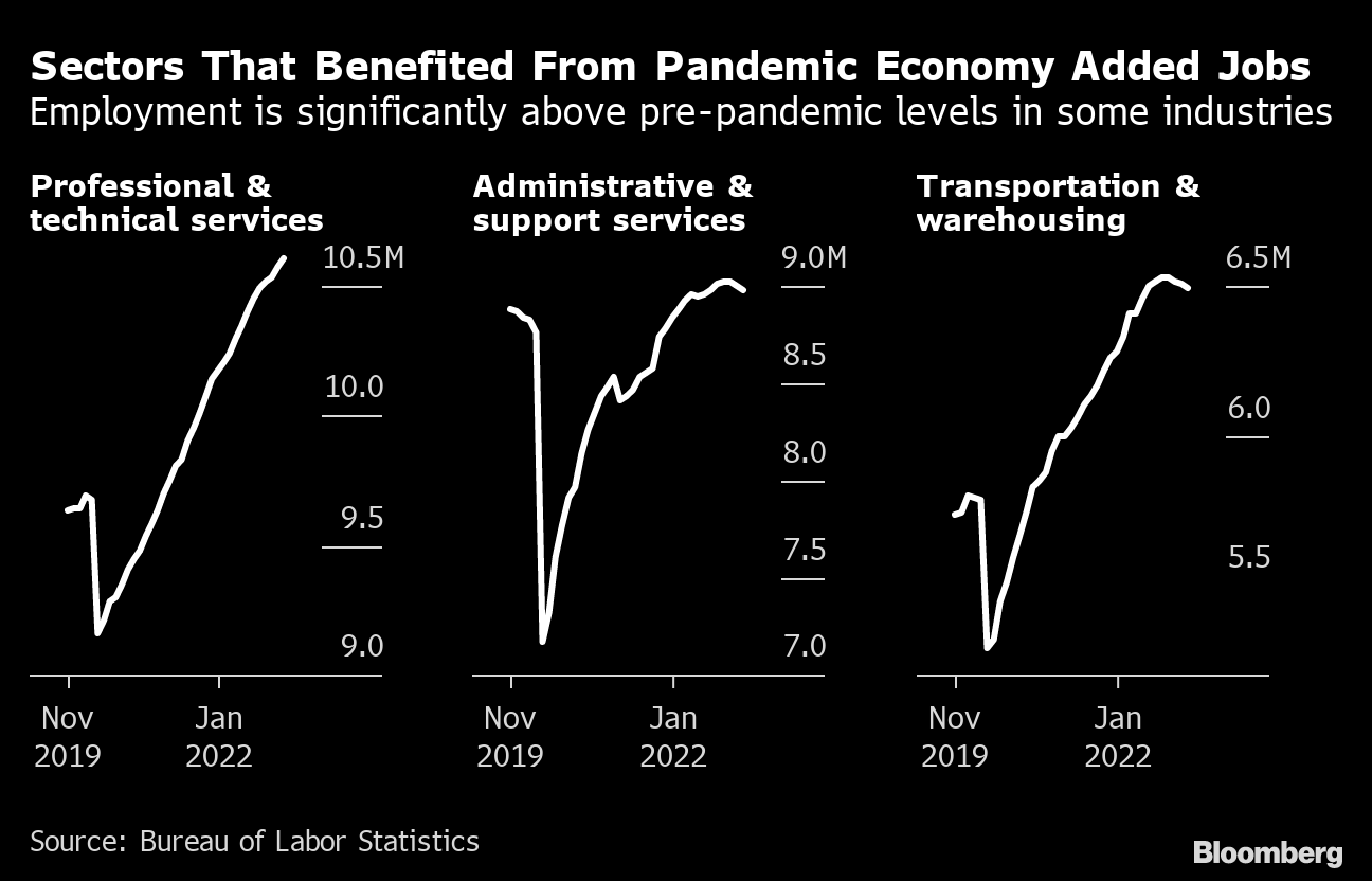 Those layoffs have started to roll over to administrative and support services. After recovering to pre-Covid staffing levels by the end of 2021 and setting a record in 2022, employment has now fallen for three straight months, the worst stretch since the onset of the pandemic.