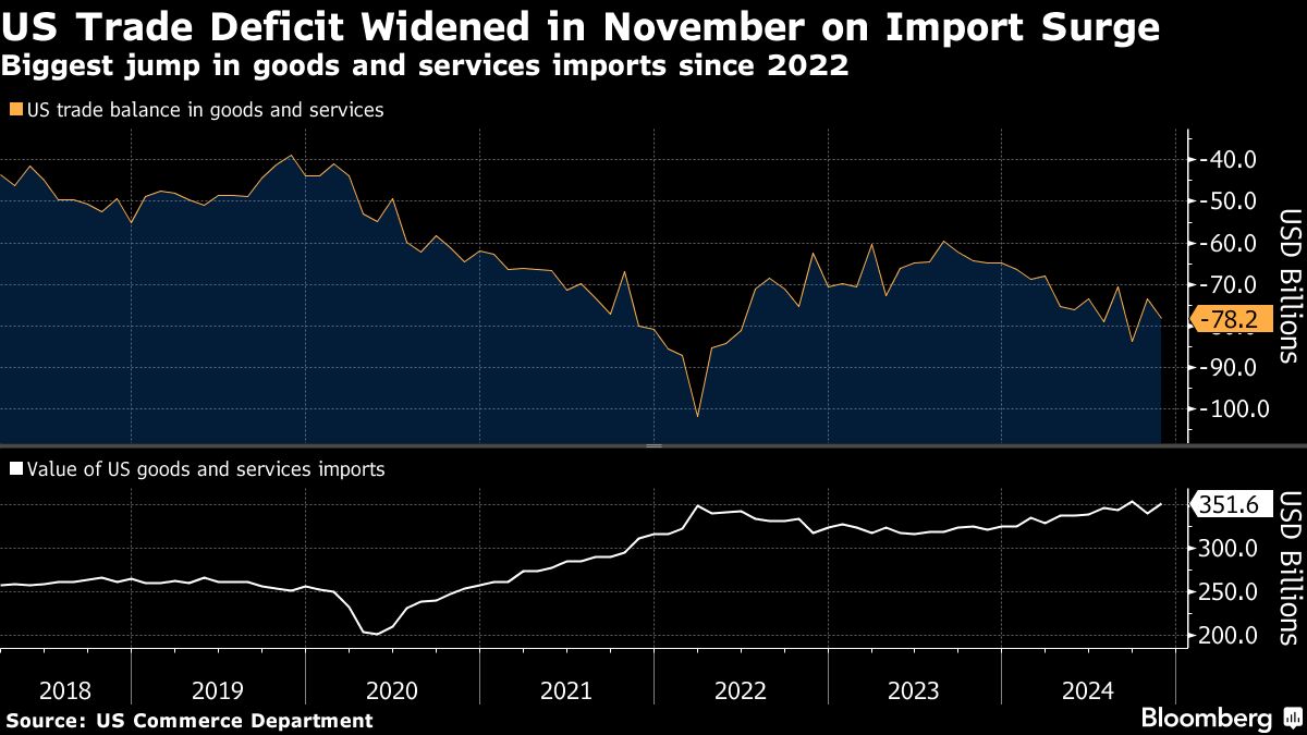 The US trade deficit widened in November, reflecting the biggest jump in imports since March 2022 as companies accelerated shipments ahead of a possible dockworkers' strike and in anticipation of potential tariffs by the Trump administration.