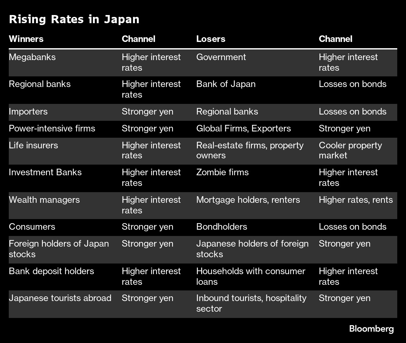 (Bloomberg) -- The Bank of Japan's steady march toward raising interest rates for the first time since 2007 begs the question of who will win and who will lose after years of massive stimulus and ultra-low borrowing costs.