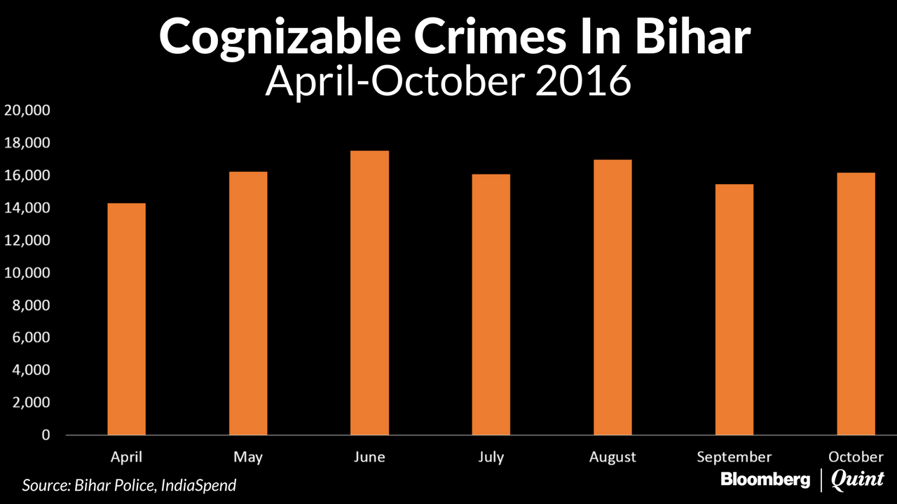 Nine months – or 270 days – into the ban, an IndiaSpend analysis of Bihar Police's crime data, reveals that cognizable crime – which the police can investigate without a magistrate's order – rose 13 percent between April and October 2016, from 14,279 in April to 16,153 in October (latest available data).