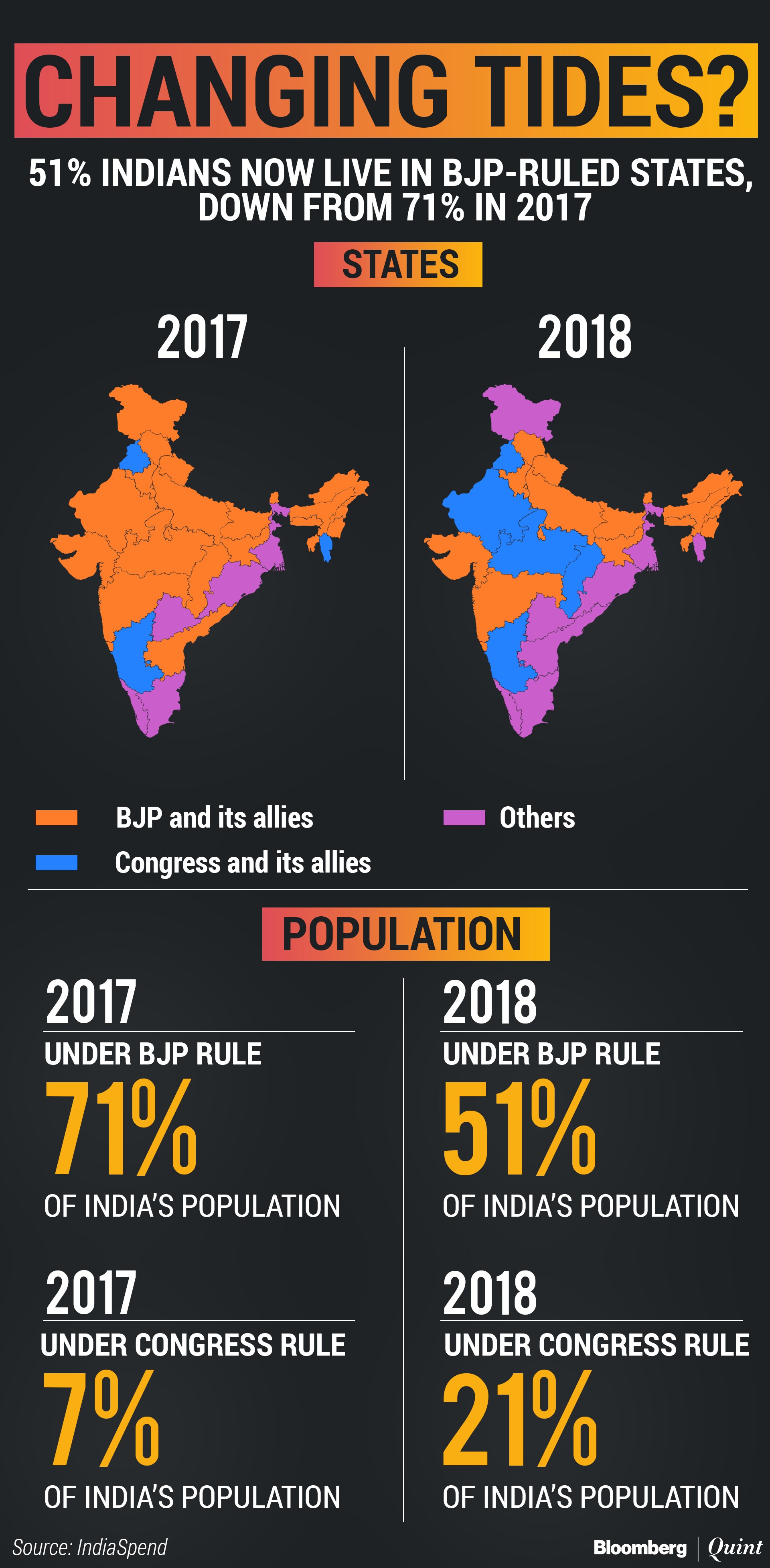 With the Bharatiya Janata Party losing power in three Hindi-heartland states--Madhya Pradesh, Rajasthan and Chhattisgarh--the population under BJP rule has dropped by 254 million, from nearly 888 million (71 percent of India's population) in 2017 to nearly 634 million (51 percent of the population) in Dec. 2018.