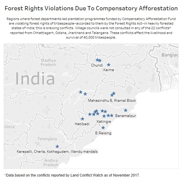 Regions where forest departments led plantation programmes funded by Compensatory Afforestation Fund are violating forest rights of tribespeople--accorded to them by the Forest Rights Act--in heavily forested states of India; this is brewing conflicts. Village councils were not consulted in any of the 22 conflicts* reported from Chhattisgarh, Odisha, Jharkhand and Telangana. These conflicts affect the livelihood and survival of 40,000 tribespeople.