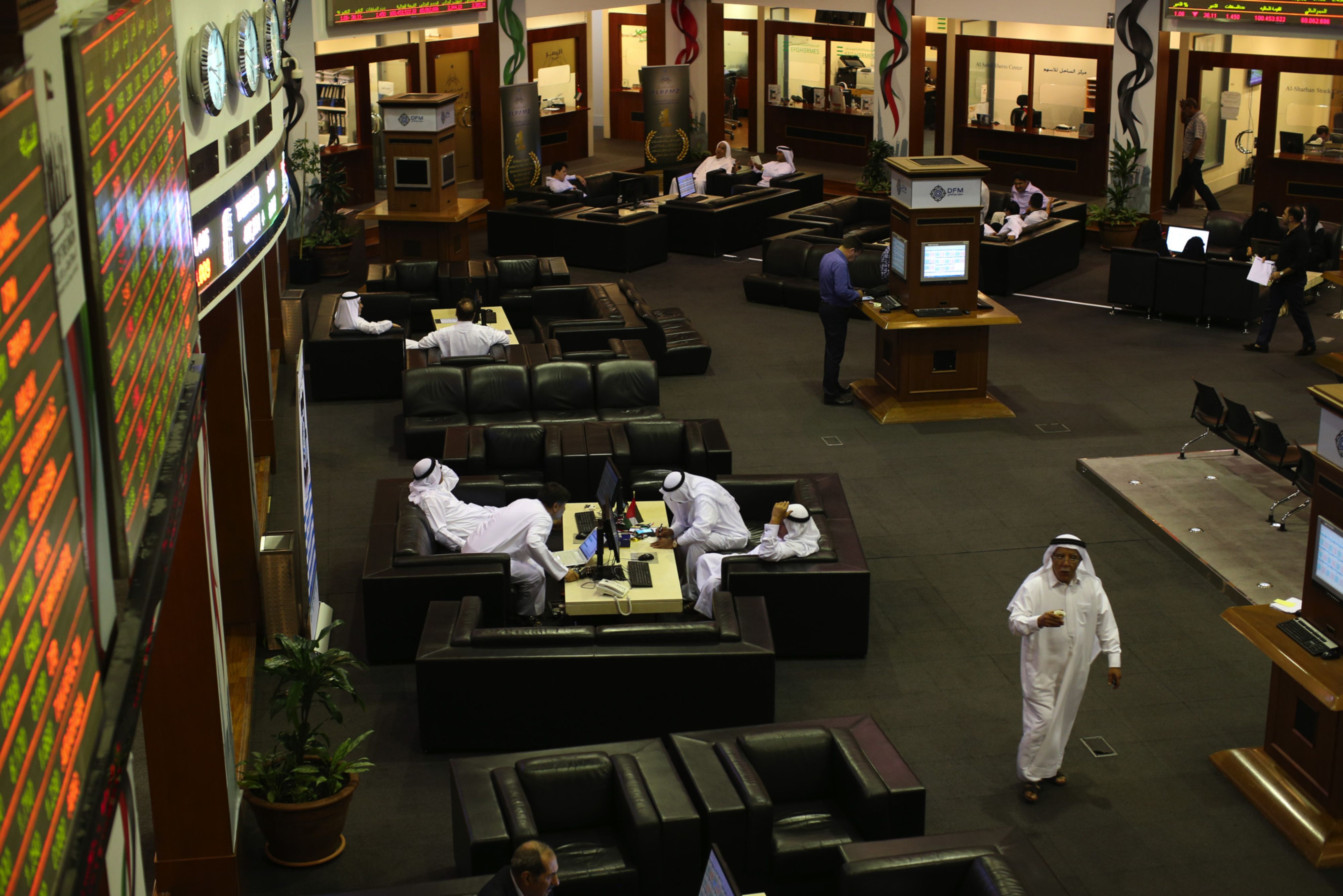 Visitors sit beneath financial information screens in Dubai. (Photographer: Jasper Juinen/Bloomberg)