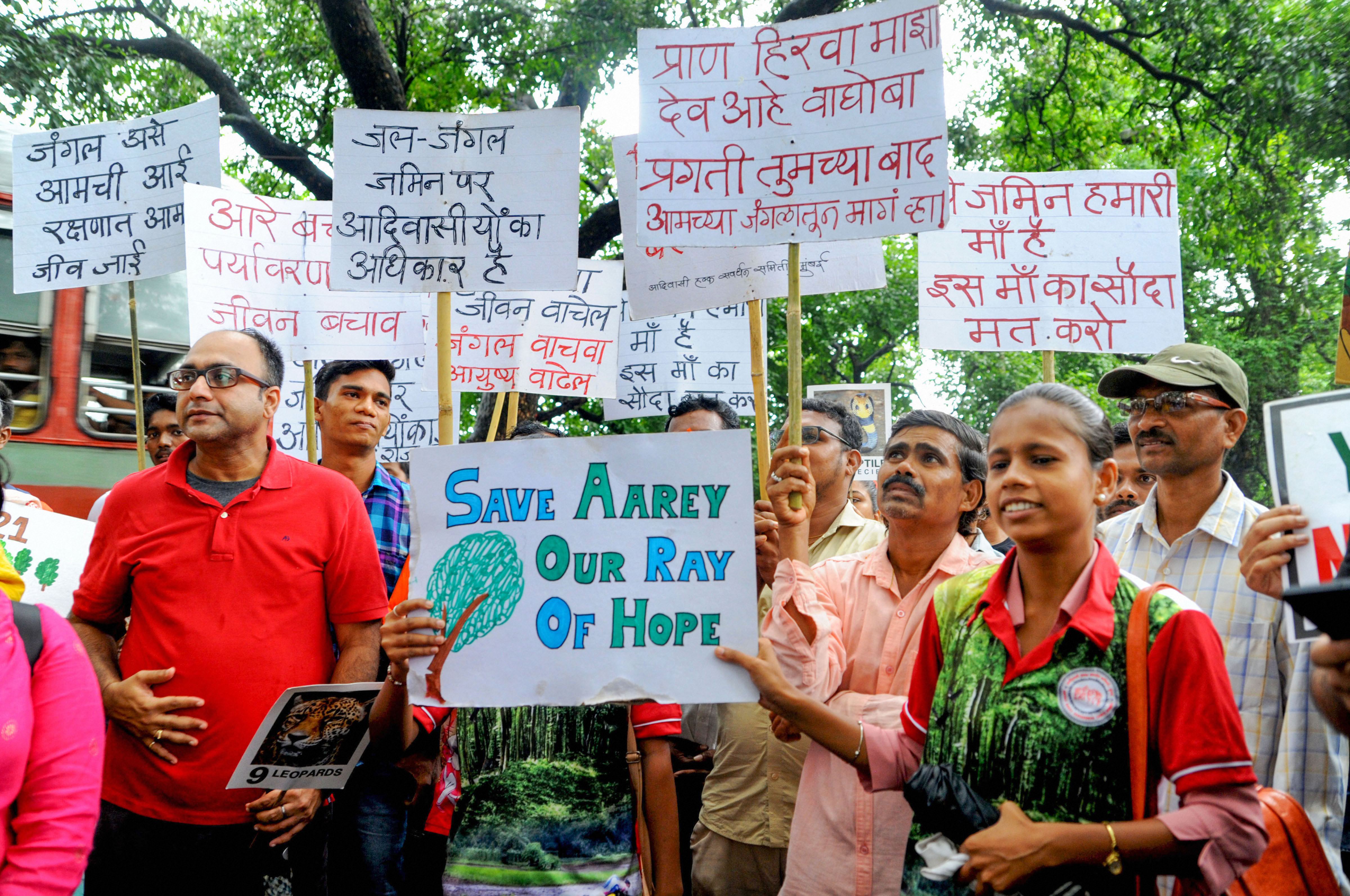Locals protest against the cutting of trees in Aarey Colony to pave way for the Mumbai Metro car shed. (Photo: PTI)