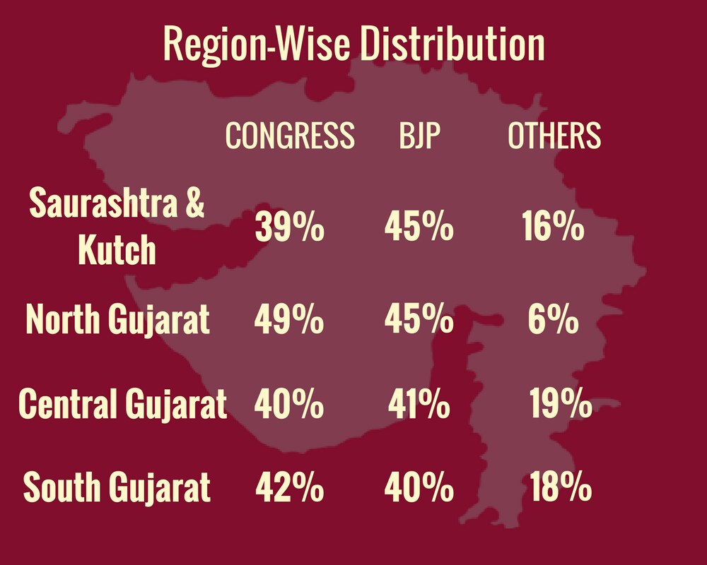 The Congress lost by three points in the Saurashtra region, when compared to the October poll. However, it gained in the central and south Gujarat seats by a considerable margin. Meanwhile, the BJP has maintained a lead in the Saurashtra and north Gujarat regions, while the baton seems to be fast slipping from their grasp in central and south Gujarat.