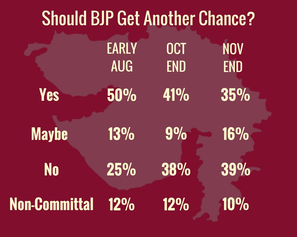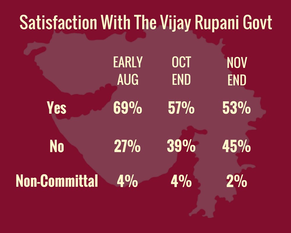 Taking off from the anti-incumbency factor, 45 percent of the voting Gujaratis do not want the Vijay Rupani government to come back to power. This number is a sharp increase from August's 27 percent.