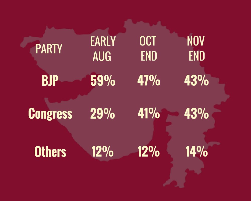The anti-incumbency factor seems to grow stronger as the polls near. The reigning sentiment at the beginning of August, ie, was a strong 50 percent in favour of the incumbent Vijay Rupani government. However, as the months progressed, the anti-incumbency factor seems to have gained a foothold, with the latest round showing a mere 35 percent in favour of the government.