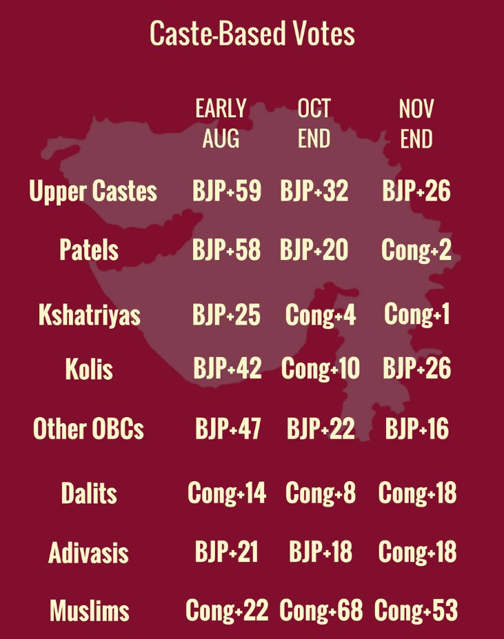 The upper castes in Gujarat remain firmly rooted with the BJP, although the margin appears to be decreasing with time. The Patels, who were earlier in BJP's camp, have shifted to the Congress with a negligible margin of votes. The Koli vote bank, which had briefly deviated to the Congress, is back with the BJP.