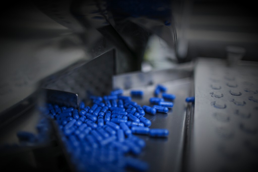 Capsules move along the production line at a pharmaceutical plant (Photographer: Dhiraj Singh/Bloomberg)