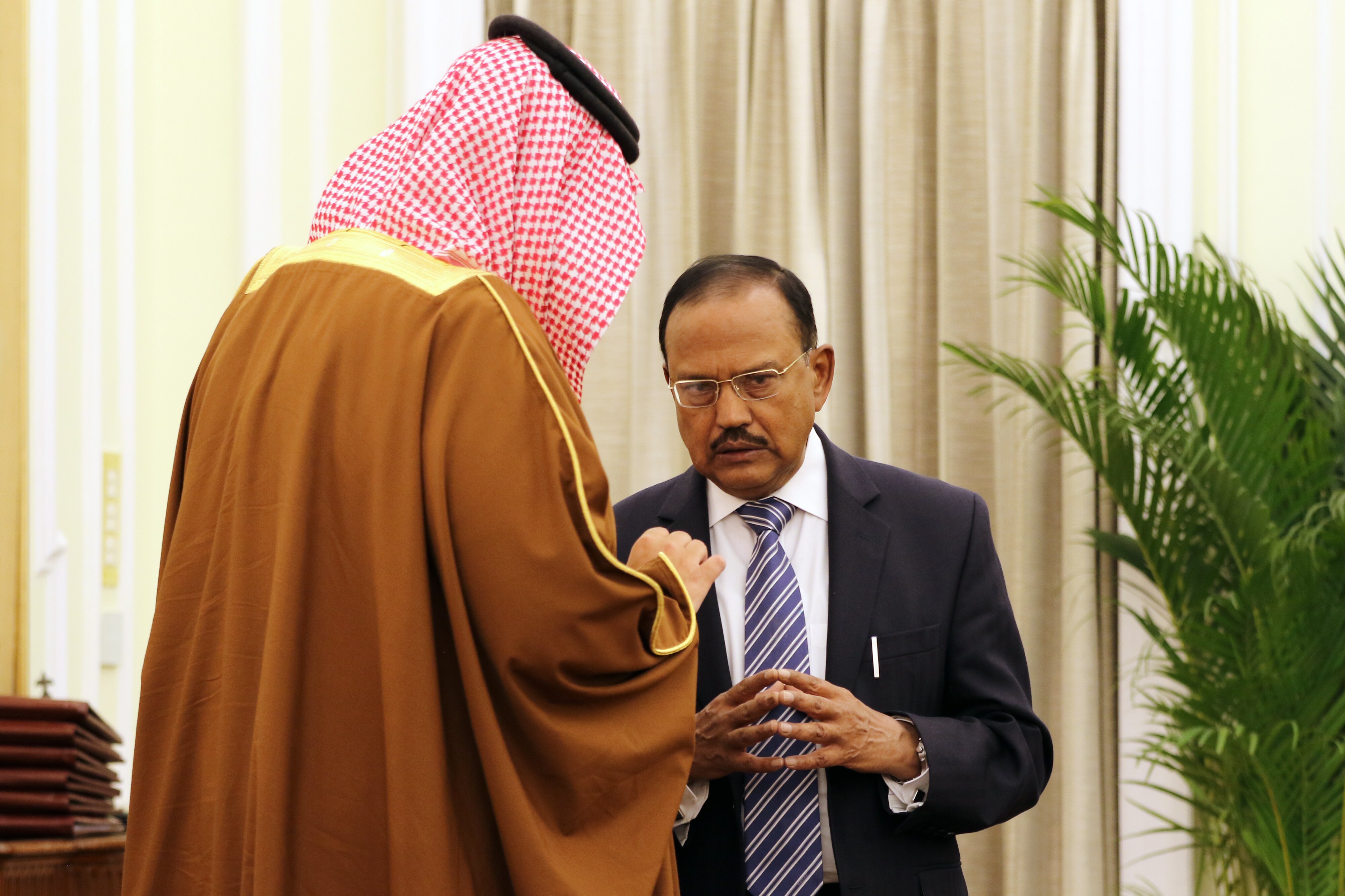 Ajit Doval, India’s national security adviser, right, speaks with a member of Saudi Arabia’s delegation during a news conference at Hyderabad House in New Delhi, India. (Photographer: T. Narayan/Bloomberg)