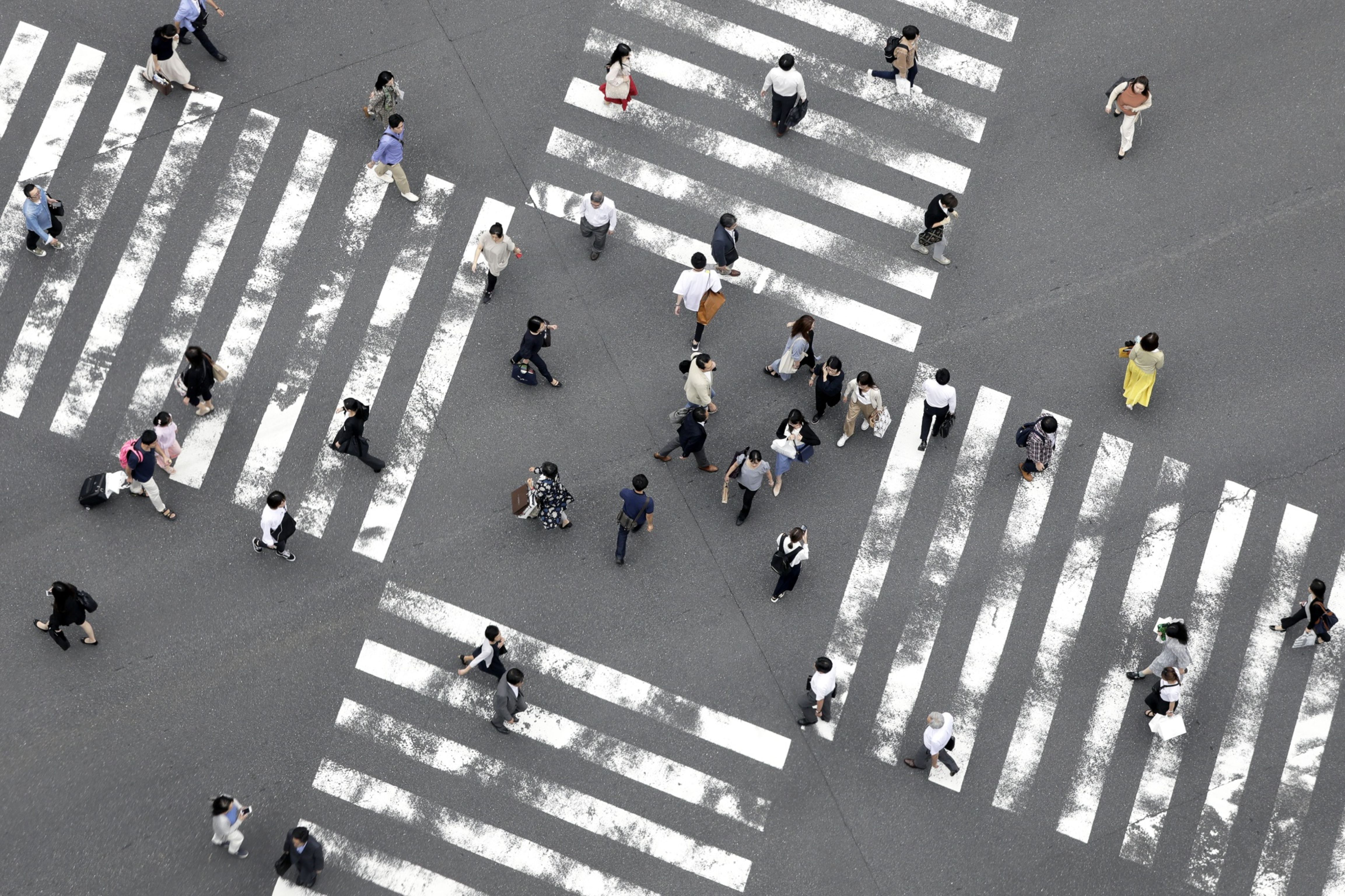Pedestrians cross an intersection. (Photographer: Kiyoshi Ota/Bloomberg)