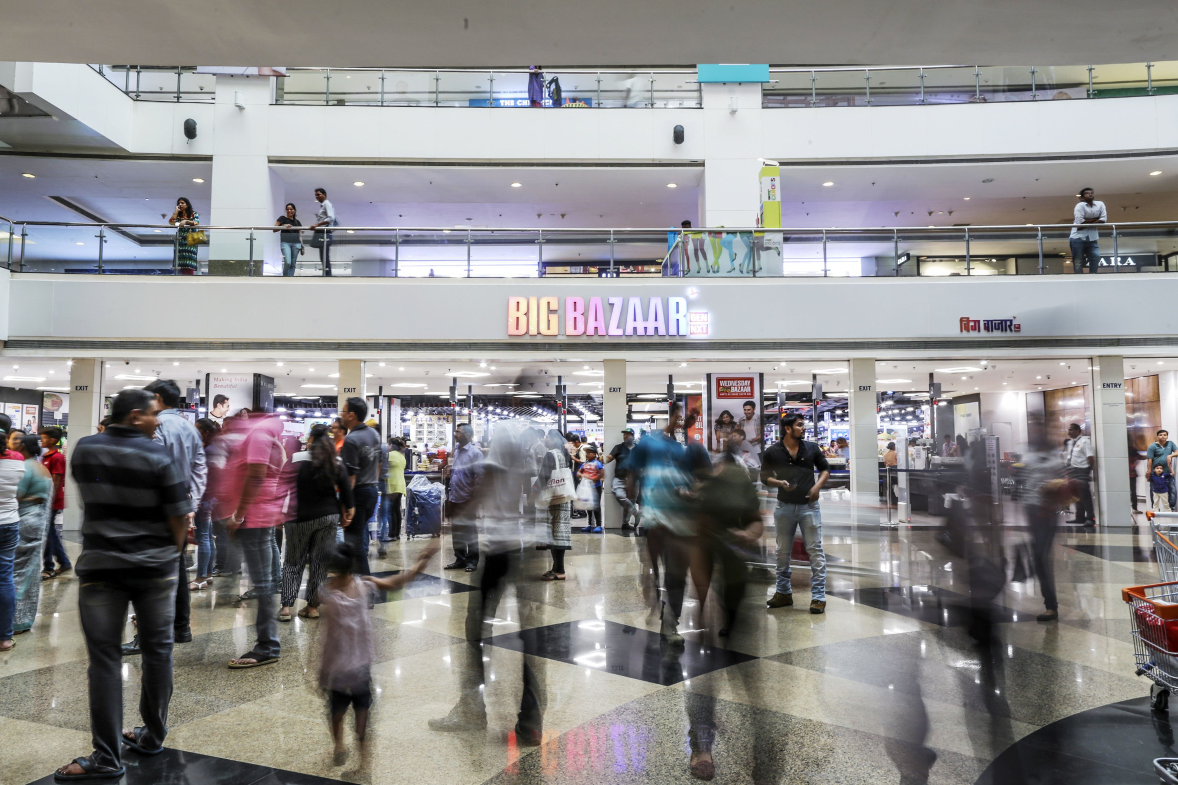 Shoppers walk and gather outside a Big Bazaar hypermarket, operated by Future Retail, in Mumbai. (Photographer: Dhiraj Singh/Bloomberg)
