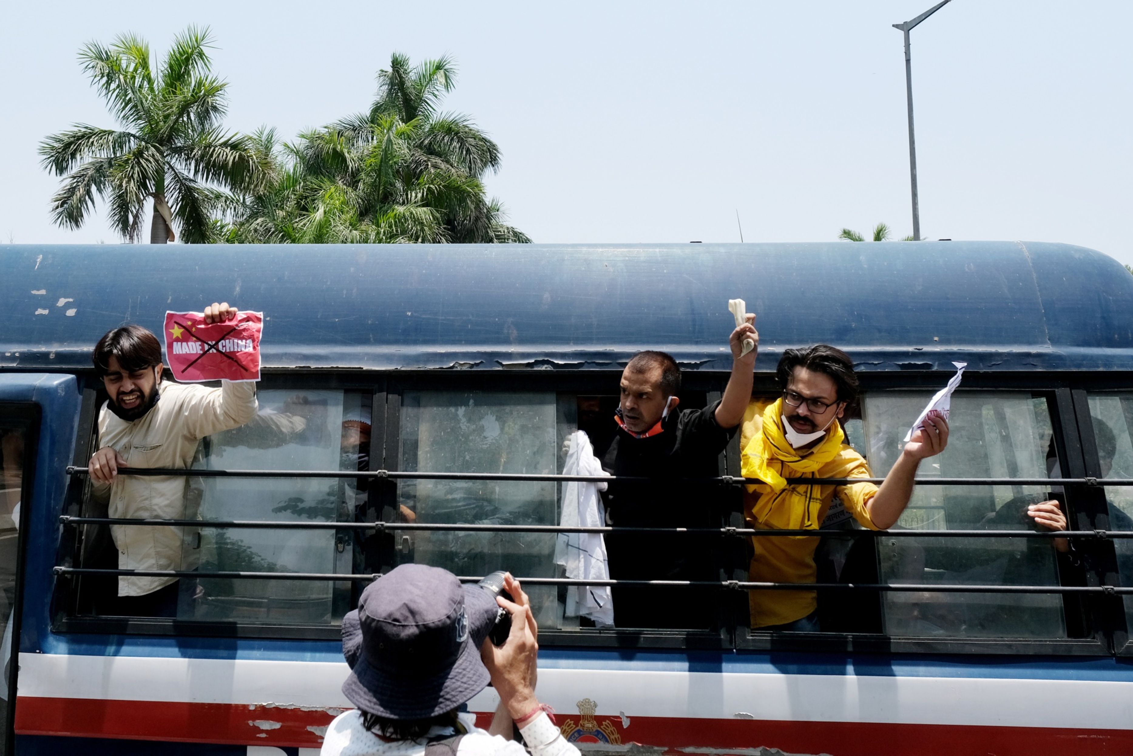 Activists from Swadeshi Jagran Manch, a wing of the Hindu nationalist organisation Rashtriya Swayamsevak Sangh (RSS), are detained in a police bus during a protest a near the Chinese Embassy in New Delhi, India, on June 17, 2020. (Photographer: T. Narayan/Bloomberg)