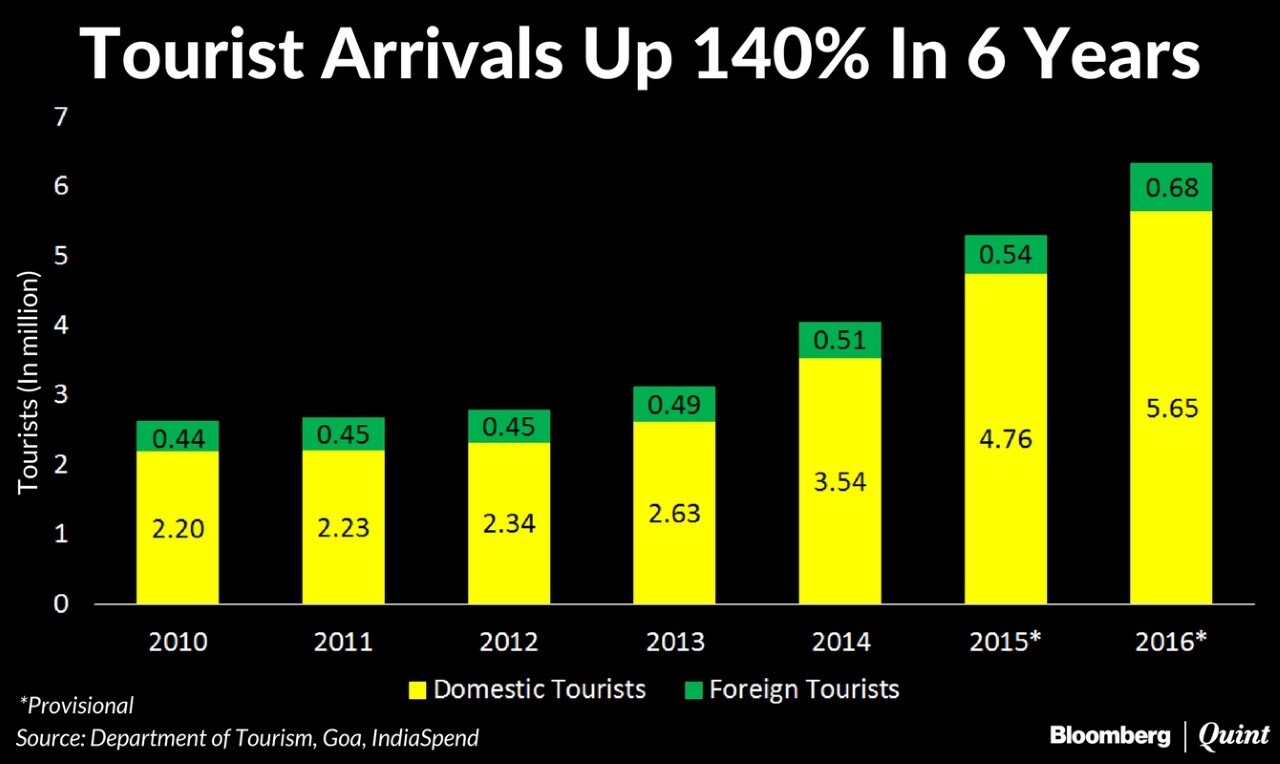 In 2016, Goa recorded 6.3 million tourist arrivals, a number that has more than doubled in the six years since 2010. In the same year, the state reported an 11% lodging capacity with 3,358 hotels offering 56,595 beds.