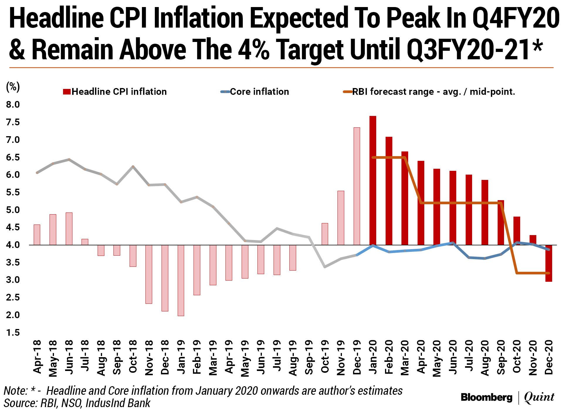 The growth and inflation forecast path underlying the MPC's decision to keep the repo rate unchanged shows that the RBI expects headline inflation to peak in the Q4FY20 and ease gradually over the next three quarters, while real GDP growth would pick-up gradually over FY21. Real GDP growth is projected at 6 percent for FY21, with 5.5-6 percent in H1FY21 and 6.2 percent in Q3FY21. Growth for the current year has been retained at 5 percent, down from 6.1 percent in FY19.