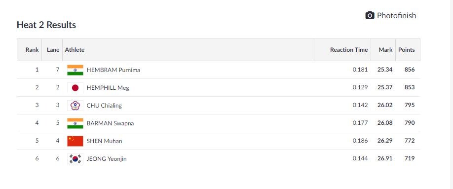 Purnima Hembram finishes first in the 200m heats with a timing of 25.34 seconds. She is currently third in heptathlon with 3424 points after four events.