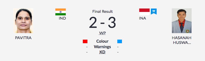 Another Indian boxer has lost her quarter-final match. Pavitra is outclassed 2-3 by Indonesia's Huswatun Hasanah in the women's light 60 kg category.